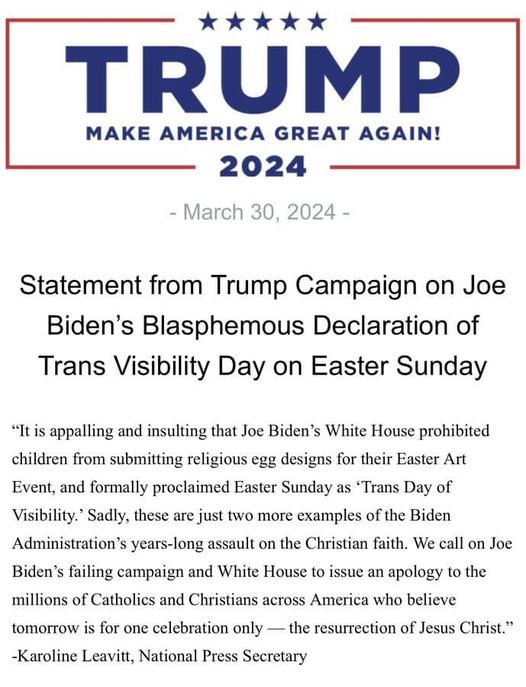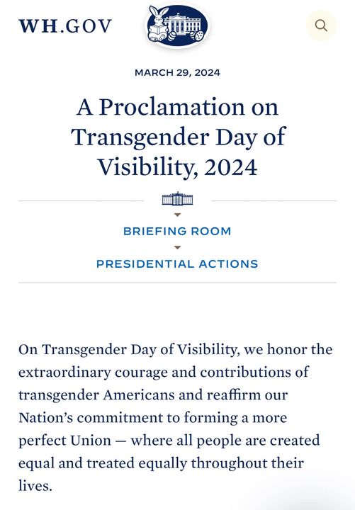 Nota: El día internacional de visibilidad de las personas transgénero se celebra desde el 2009. El Presidente Biden en 2021, lo adoptó por primera vez en EU. Si bien podemos reconocer que Semana Santa no siempre cae en marzo, Biden no tenía que hacer la proclama Viernes Santo.
