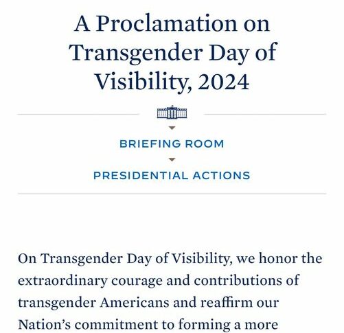 Citando al Presidente Biden en su proclama: “…proclamar el 31 de marzo de 2024 como Día de la Visibilidad Transgénero. Hago un llamado a todos los estadounidenses a unirse a nosotros para elevar las vidas y las voces de las personas transgénero en toda nuestra nación y trabajar para eliminar la violencia y la discriminación basada en la identidad de género”.